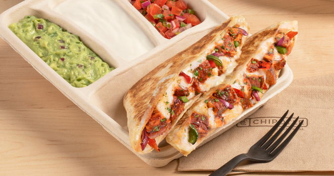Chicken al Pastor Quesadilla with Fajita Veggies and a side of Guacamole, Sour Cream, and Tomatillo-Red Chili Salsa